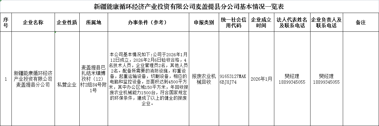为贯彻落实《新疆维吾尔自治区农业机械报废更新补贴实施方案》(新农机〔2020〕151号)、《新疆维吾尔自治区关于加大工作力度持续实施好农业机械报废更新补贴政策的实施方案》(新农机〔2024〕717号)、《新疆维吾尔自治区2024-2026年农机购置与应用补贴实施方案》(新农机函〔2024〕740号)相关要求,为切实做好麦盖提县农业机械报废更新补贴工作,更好更快推进农业高效发展,经企业申报,麦盖提县农业农村机械化发展中心按规定审查复核,截至目前,新疆能康循环经济产业投资有限公司麦盖提县分公司为合规报废农业机械回收企业,请有农机报废回收及报废更新补贴业务需求的单位和个人,自主选择该企业办理相关业务。现公示如下: