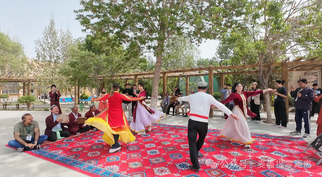 在麦盖提县“刀郎画乡”景区,参访团成员与非物质文化遗产代表性传承人弹唱刀郎木卡姆,同当地农民画家并肩创作,高亢的刀郎木卡姆与一幅幅鲜活的刀郎农民画,生动呈现了当地群众安居乐业的幸福生活。