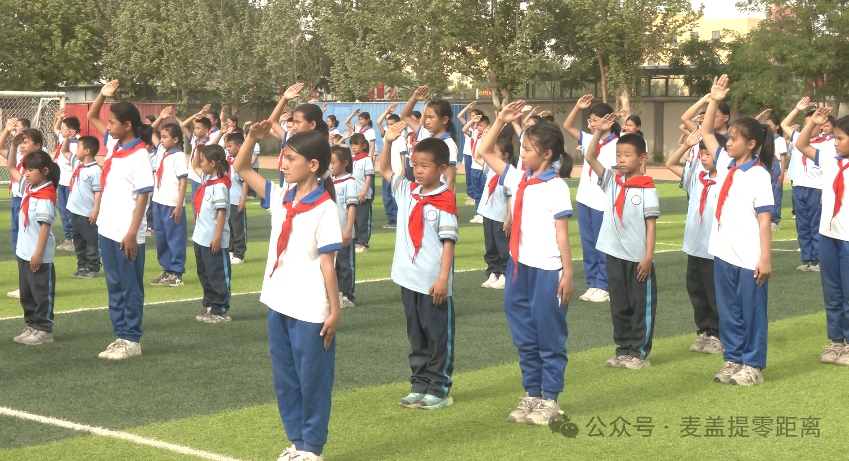 仪式在庄严雄壮的少年先锋队出旗曲中正式拉开帷幕。全体师生整齐肃立,少先队员行队礼,鲜红的少先队队旗迎风舒展,熠熠生辉。全体师生齐唱《中国少年先锋队队歌》,嘹亮清澈的歌声回荡在校园操场,字字铿锵、句句深情,饱含着少年学子的赤诚初心与使命担当,充分展现出新时代少年蓬勃向上、锐意进取的精神风貌。