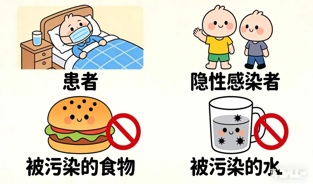 传播强:感染者与无症状者均为传染源,症状消失后仍可排毒2-3周;可通过污染食物/水、接触被污染表面、吸入呕吐物气溶胶传播,少量病毒即可致病。